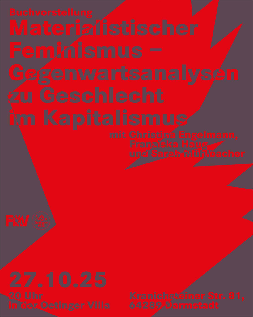 Am 27. Oktober werden die Autor:innen Christina Engelmann und Franziska Haug in der Oetinger Villa über die im Band versammelten feministischen Analysen der Geschlechterverhältnisse im Kapitalismus sprechen. Wie verhält sich die Geschlechterdifferenz zu anderen Herrschafts- und Widerspruchskonstellationen kapitalistischer Gesellschaften? Was haben vergeschlechtlichte Arbeitsteilung, patriarchale Verwandtschaftsbeziehungen und die Kontrolle weiblicher Sexualität und Begehren mit der kapitalistischen Verwertungslogik zu tun? Inwiefern scheint es angezeigt, queere und materialistische feministische Analysen miteinander zu verbinden, um diese Fragen in ihrer Komplexität zu erschließen? Auf dem Podium werden wir diskutieren, wie sich Ausbeutung und Ungleichheit im Geschlechterverhältnis aus der Perspektive einer materialistisch-feministischen Gesellschaftstheorie analysieren lassen und welche Implikationen sich aus ihr für emanzipatorische Kämpfe der Gegenwart ergeben.